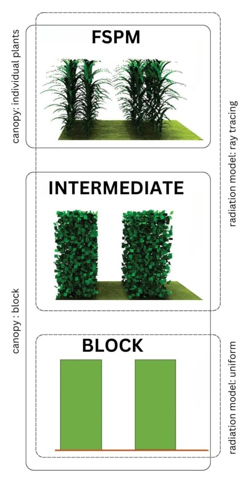 Debido a que los modelos FSPM y de bloques utilizados por la Dra. Li diferían en dos aspectos clave (cómo simulaban la radiación y el dosel), sería imposible determinar qué factores contribuyeron a las diferencias entre sus intercepciones de luz simuladas. Para determinar si las variaciones entre los resultados del FSPM y del modelo de bloques se debían al componente de radiación, creó un modelo de intermedio modelo que utilizó el trazado de rayos para el modelo de radiación y estructuras de bloques para el dosel. La comparación del modelo intermedio con el FSPM demostrará cómo las representaciones simplificadas de plantas y el dosel influyen en la intercepción de luz calculada, mientras que la comparación con el modelo de bloques ilustrará el impacto del componente de radiación simplificado en la intercepción de luz.