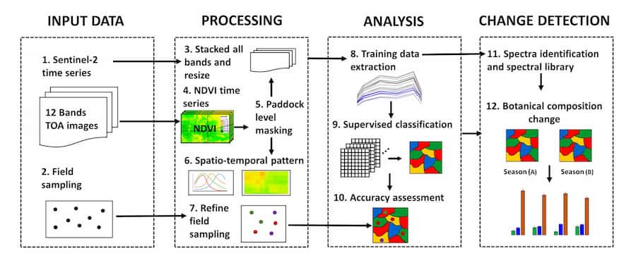 The authors demonstrated that 10 m multispectral imagery can be reliably used to distinguish between pasture species as well as seasonal changes in botanical composition. Across seasons and paddocks, the approach predicted pasture classes with 75-81% accuracy.